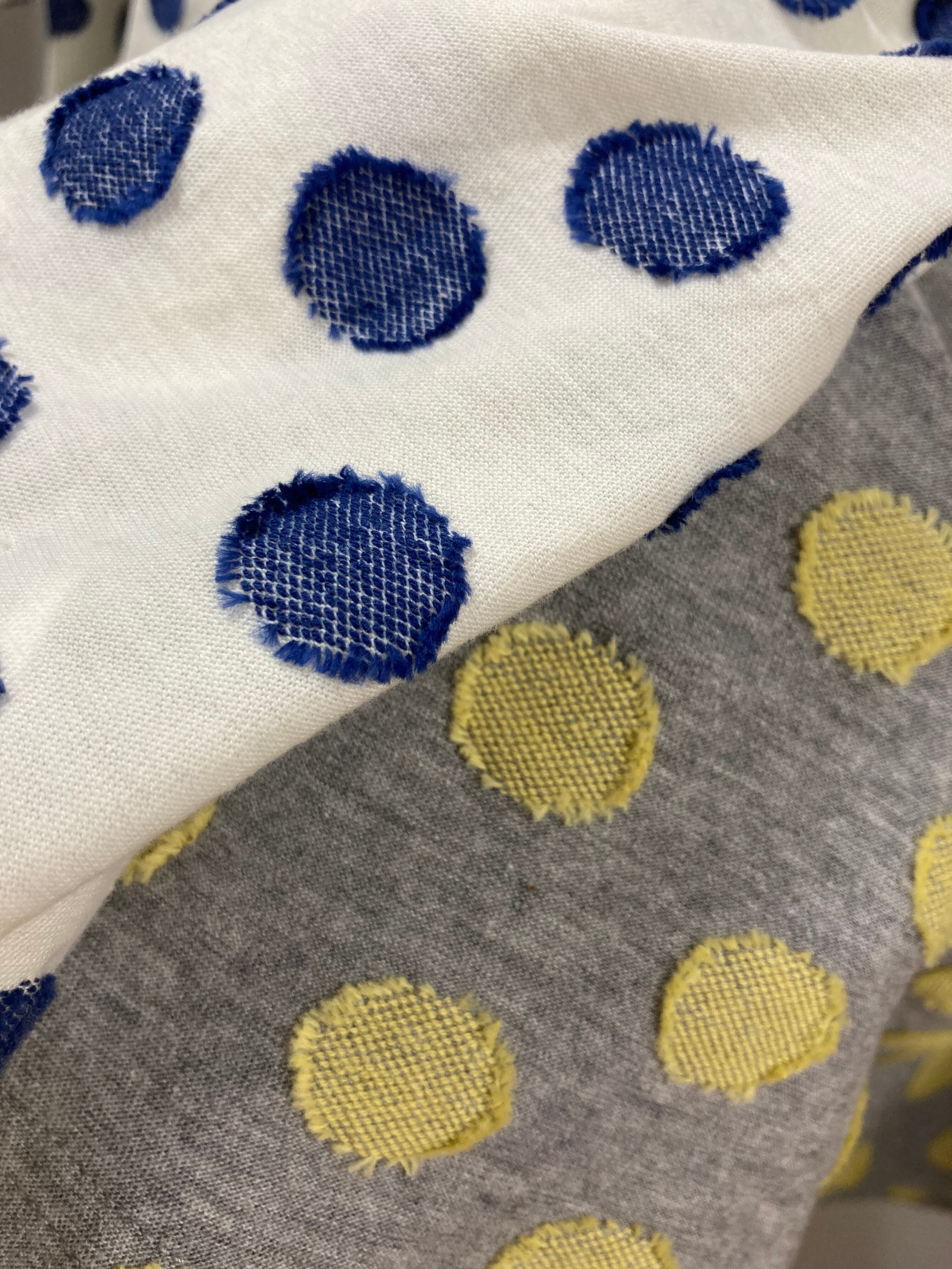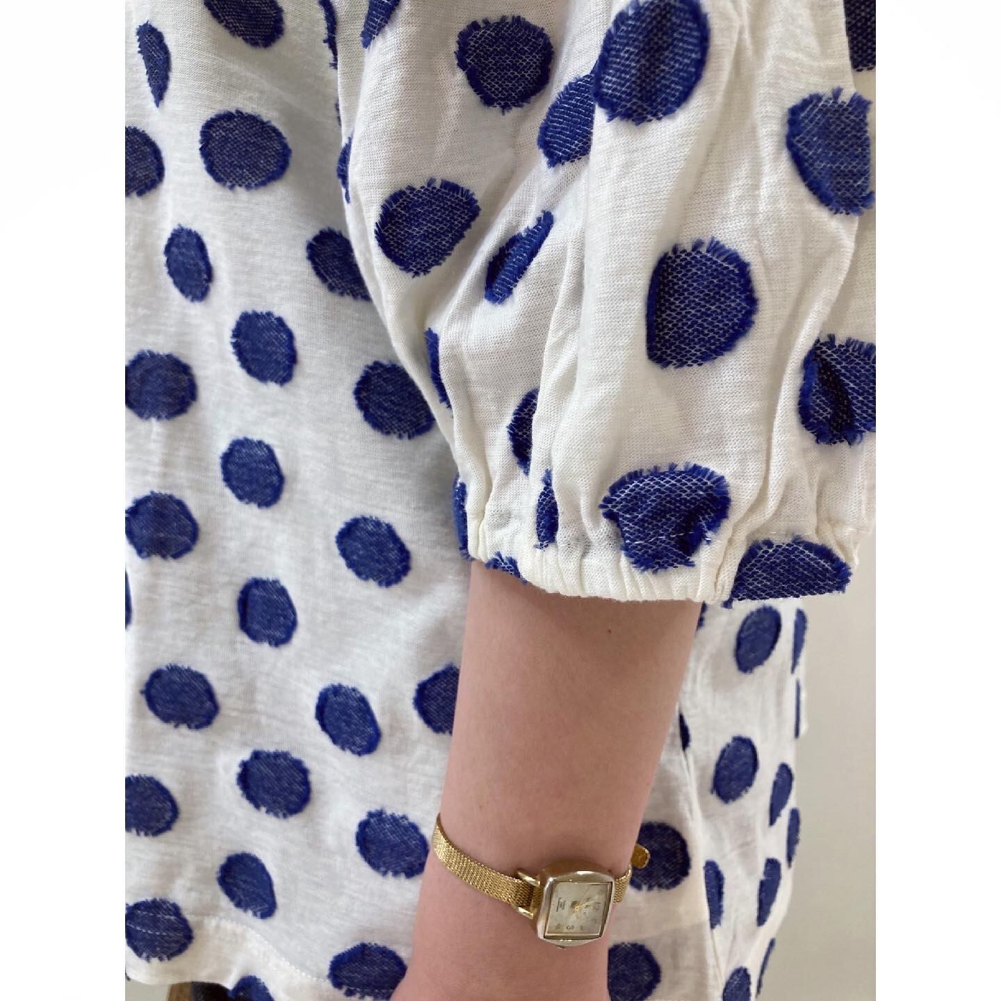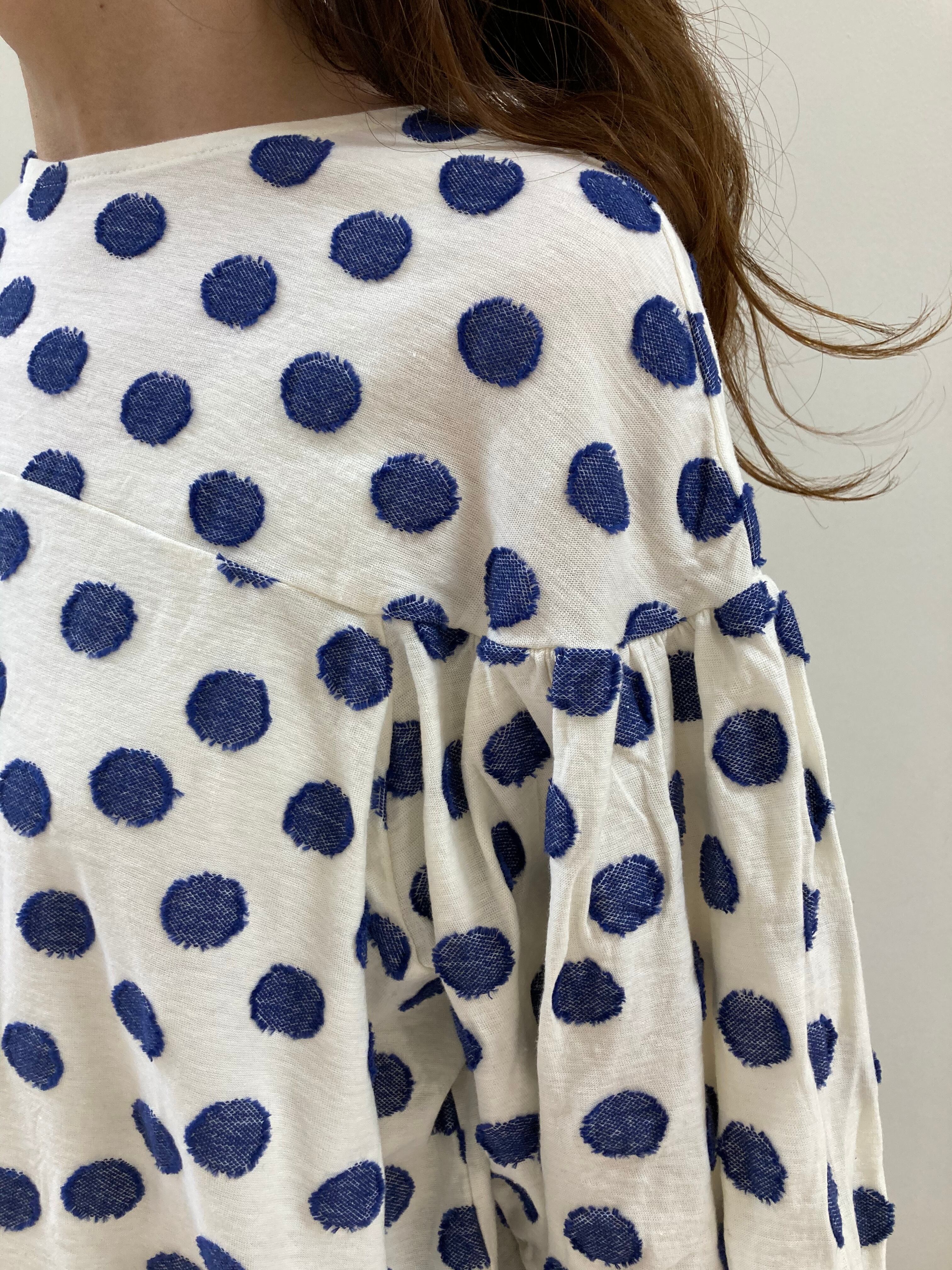 柔らかい生地のドットカットジャガード。ふんわりしたデザインでお袖が長めになります。袖口がゴム。立体的なドットが楽しいプリオーバーです。
