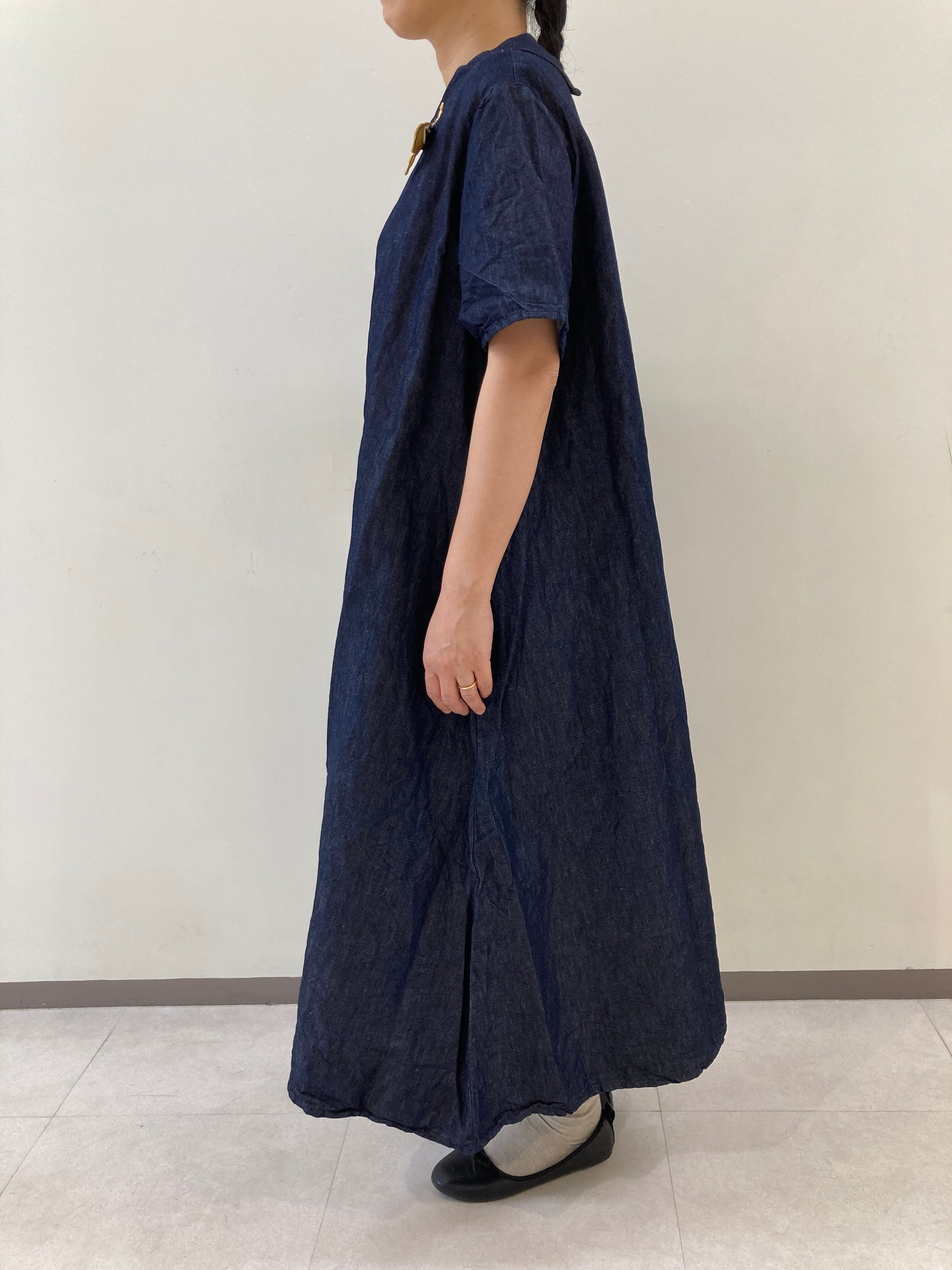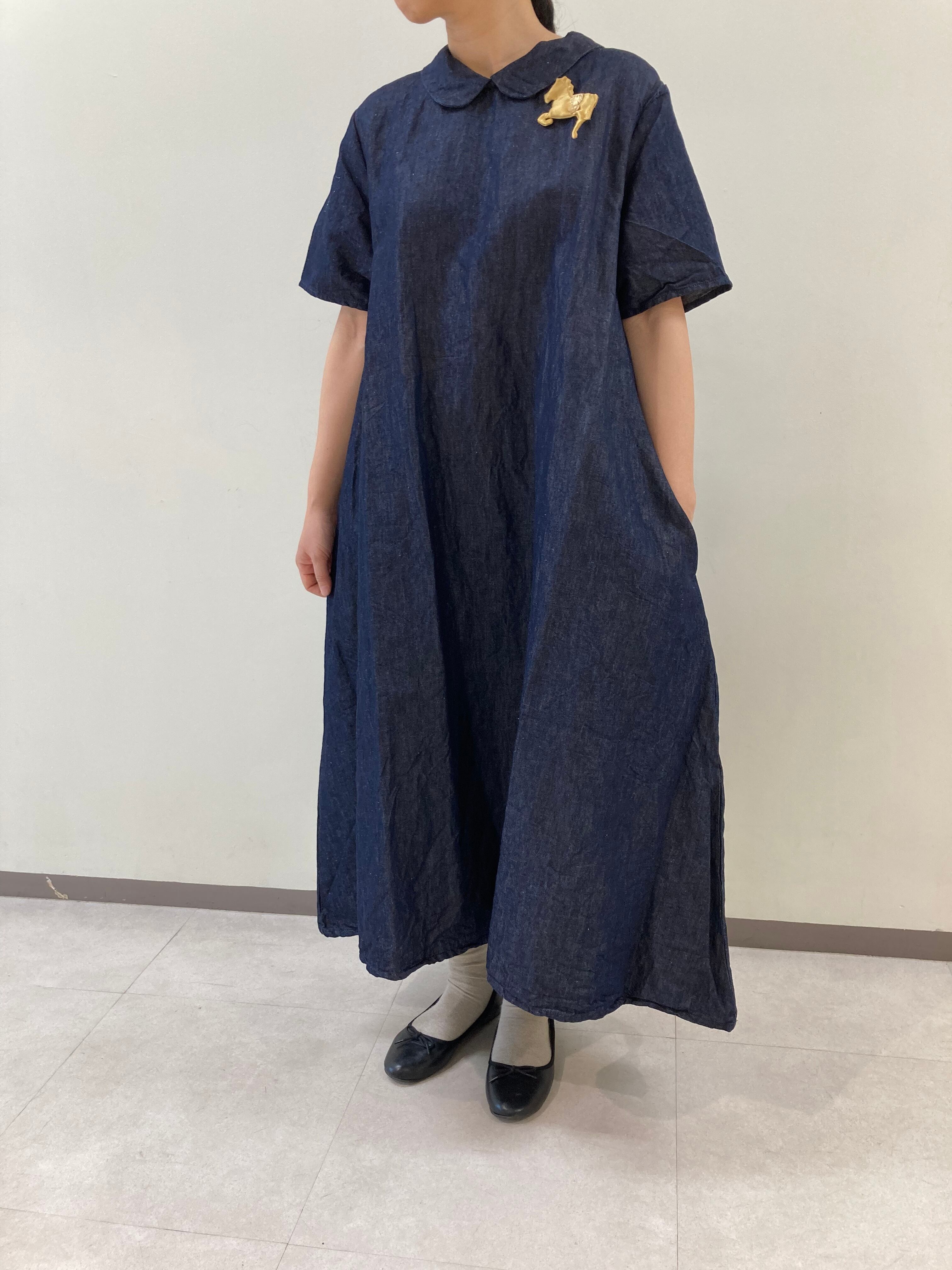 コットンリネンのインディゴ素材。衿付きで可愛いワンピースは、季節問わず着ていただけます。カジュアルになりすぎない、大人な一枚です。両サイドポケットあり。お洗濯可能。