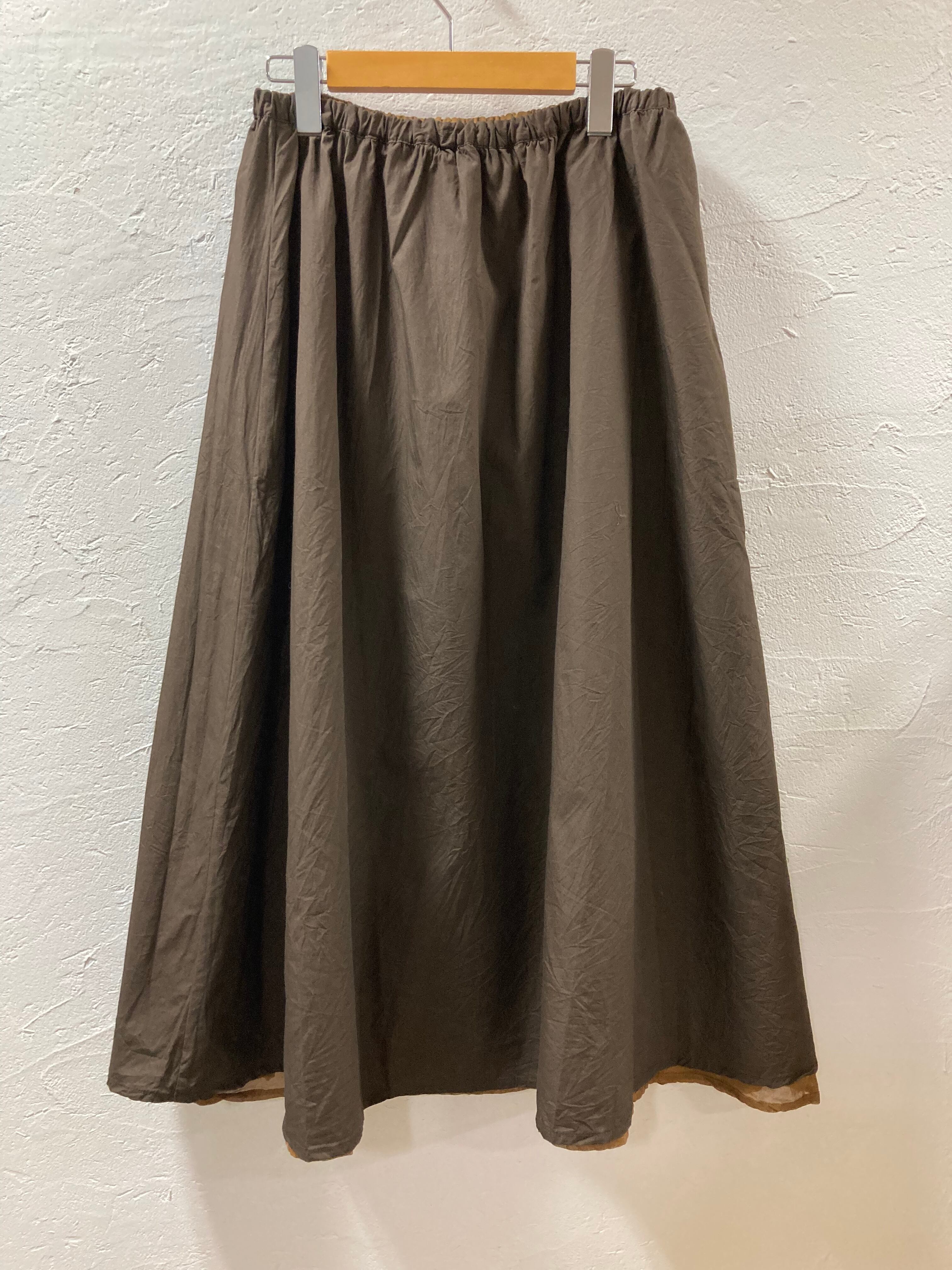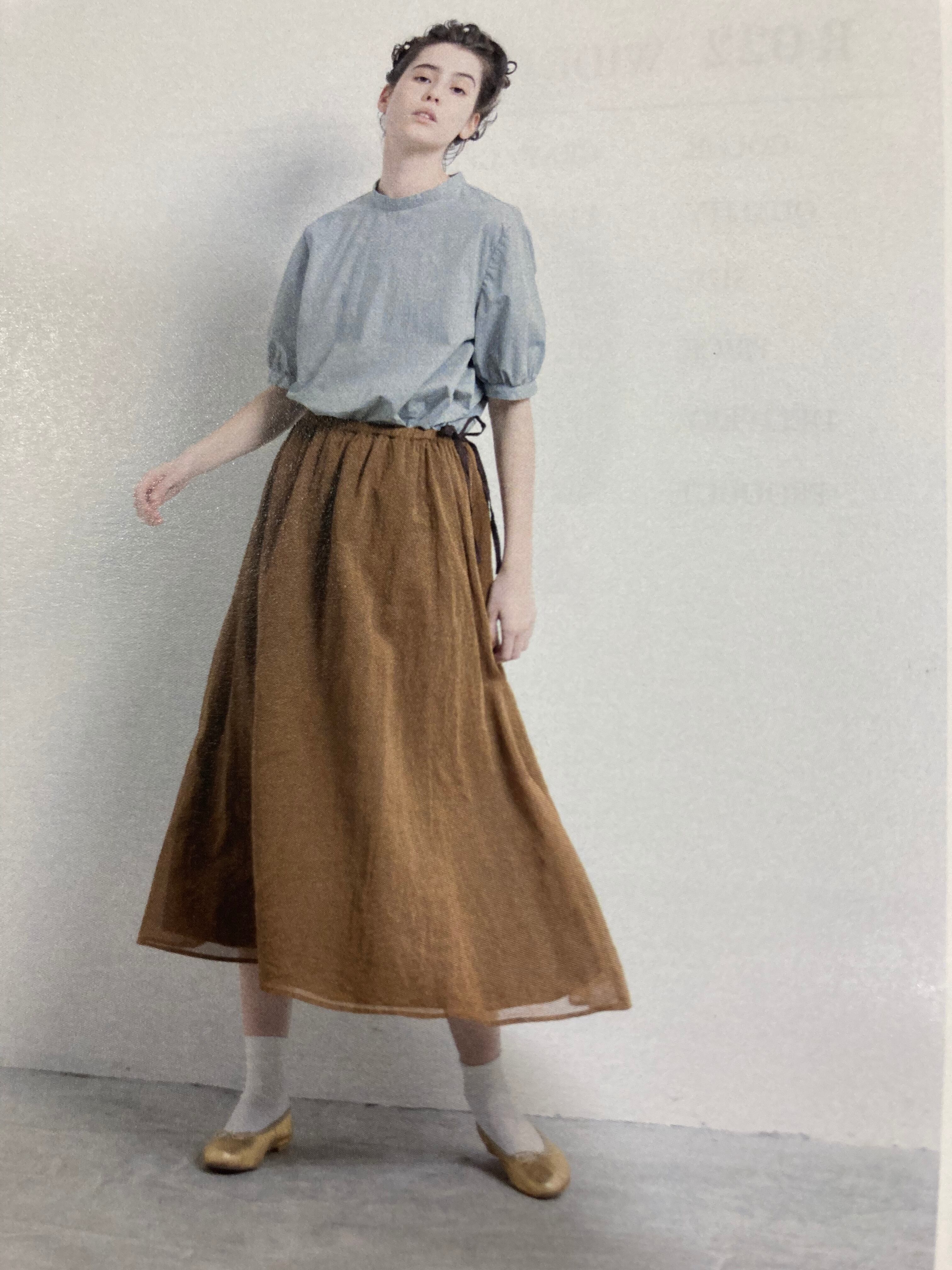 透けるオーガンジーを表にしてフェミニンに。コットンブロードを表にして上品に、表情の異なるスカートを一枚で楽しんでいただけます。ウェストゴムとリボンで調節できます。そこまでボリュームは出ずすっきりしたスカートです。内側の生地が、チラチラ裾から覗きます。お洗濯可能