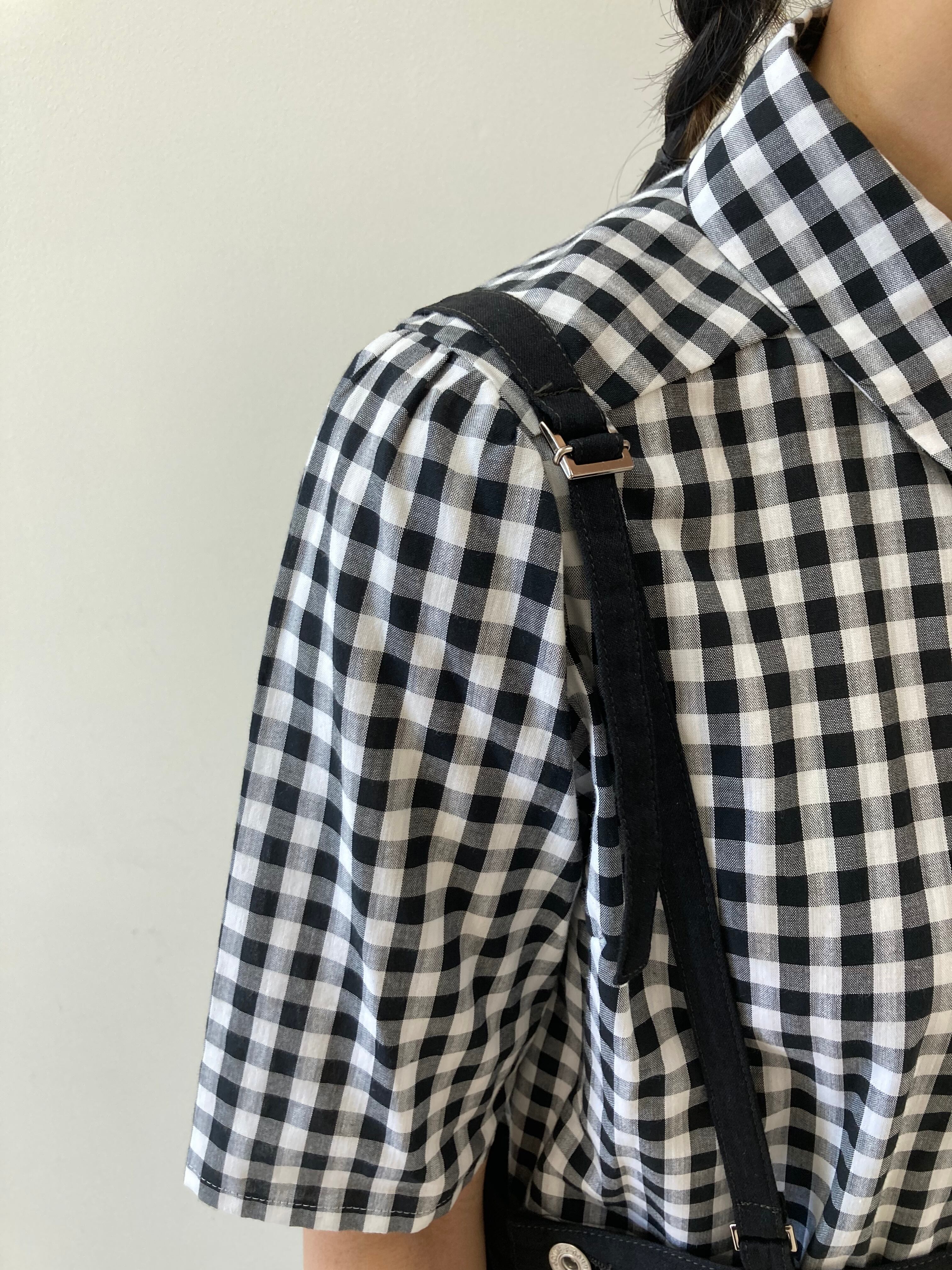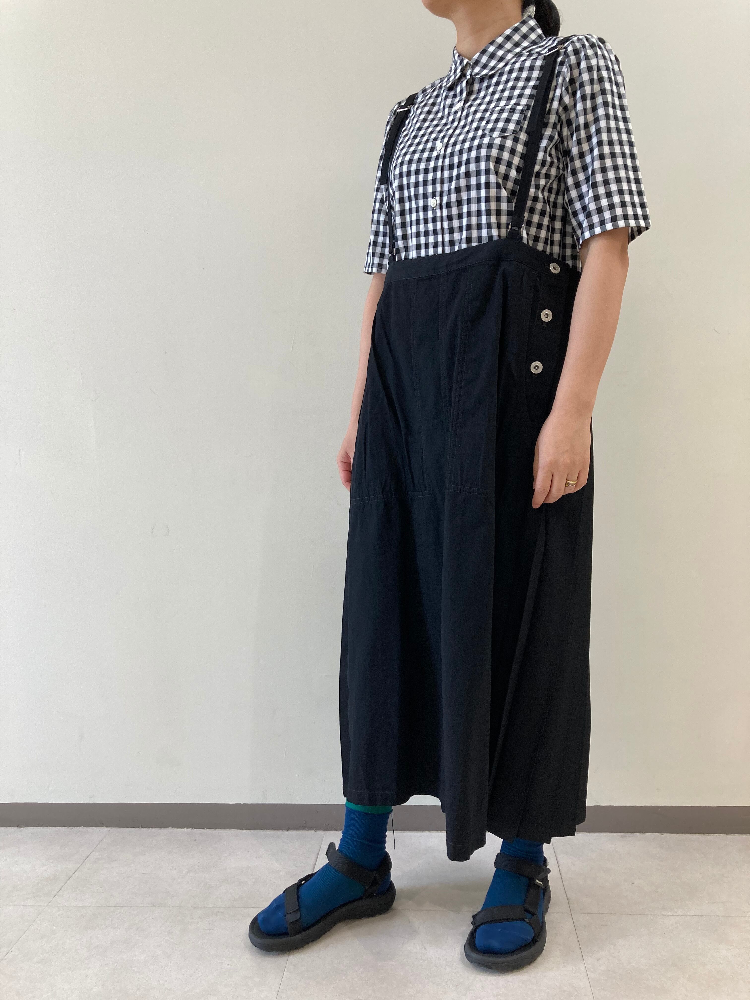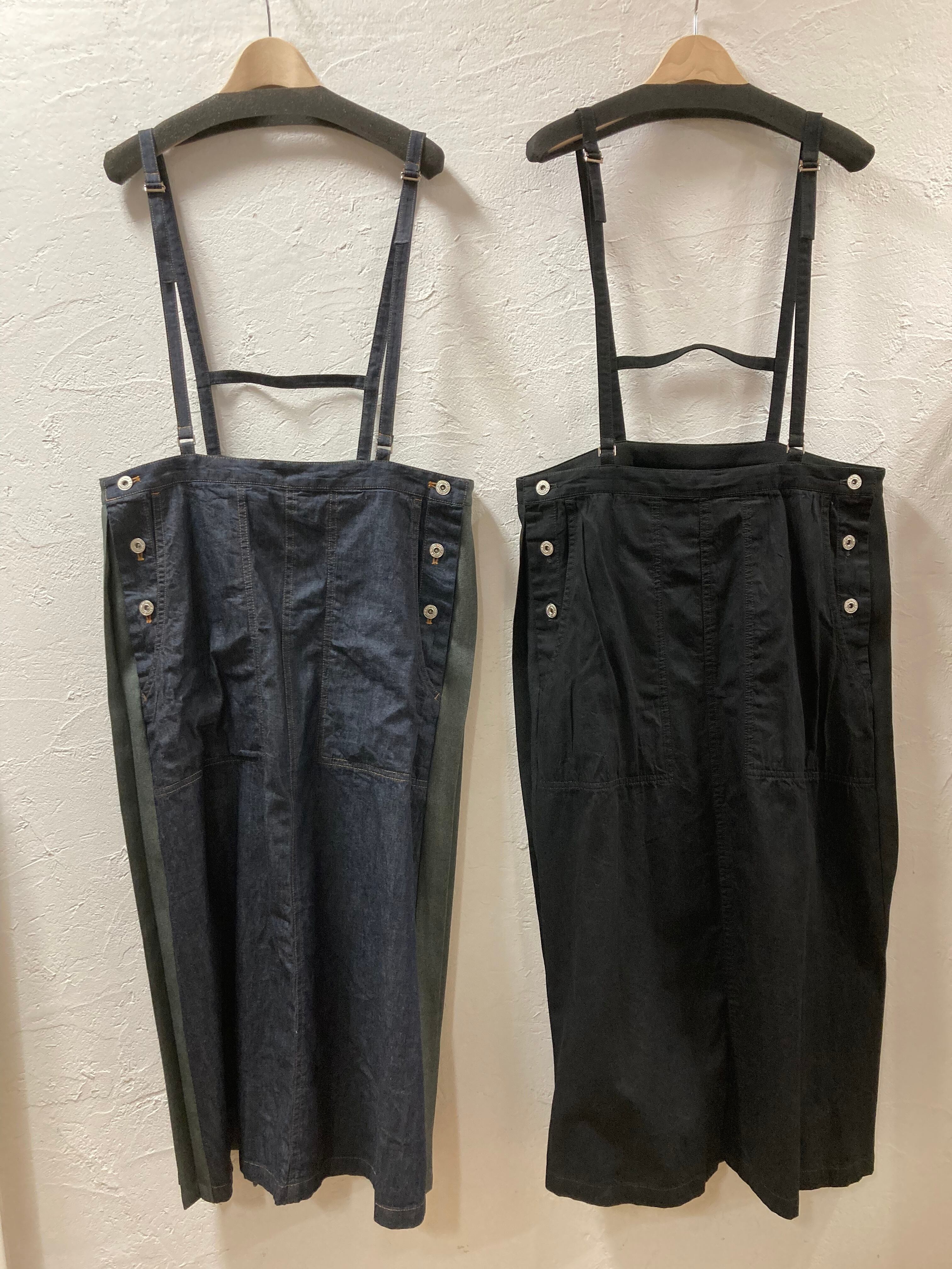 前はデニム、後ろは異素材のプリーツスカートです。細めの肩紐で、着ていただきます。ウェストは広めにとってあります。インナーにシャツから薄手のニットなどいれて、オールシーズン着ていただけます。サイドボタン開閉できます。