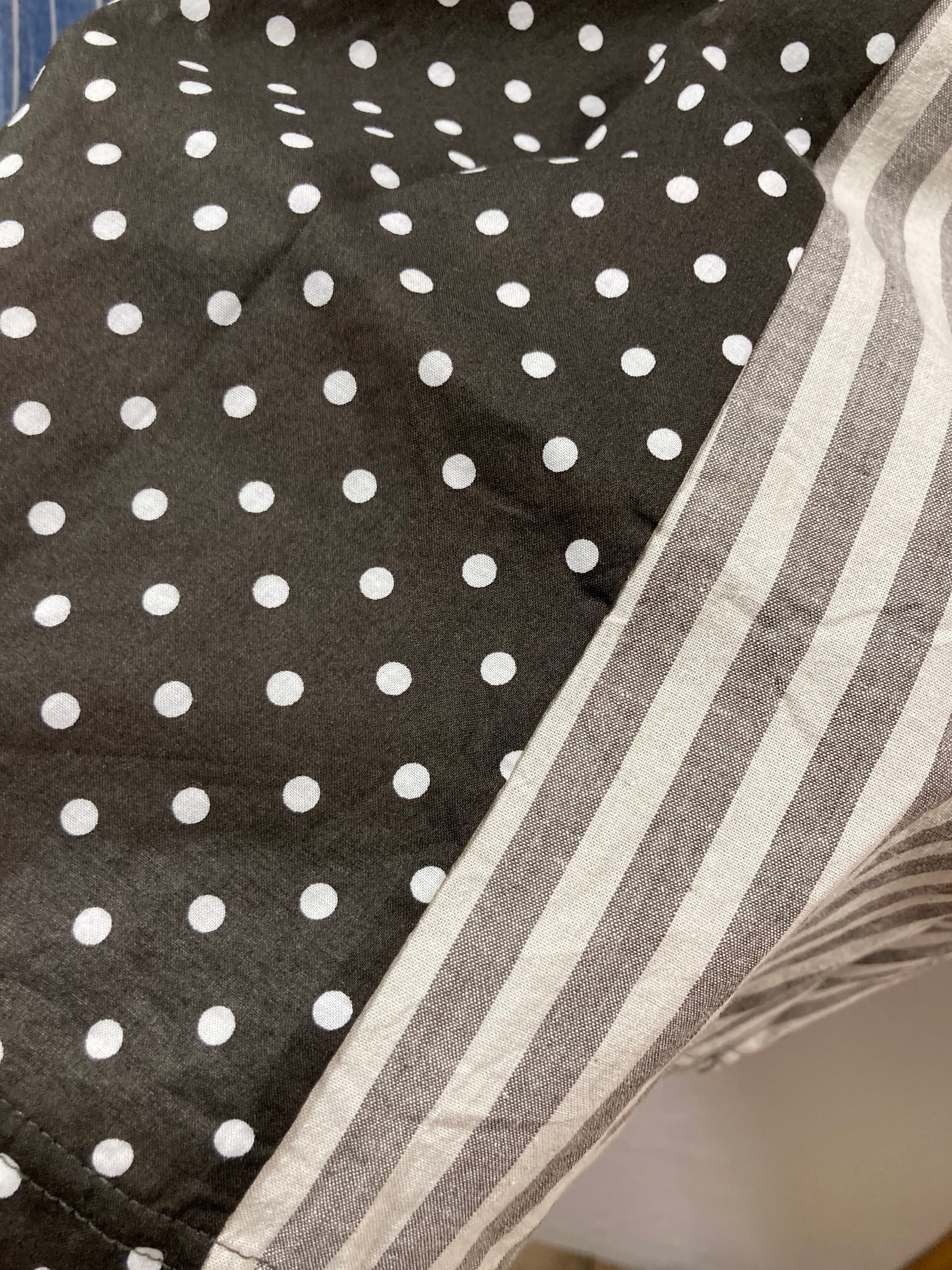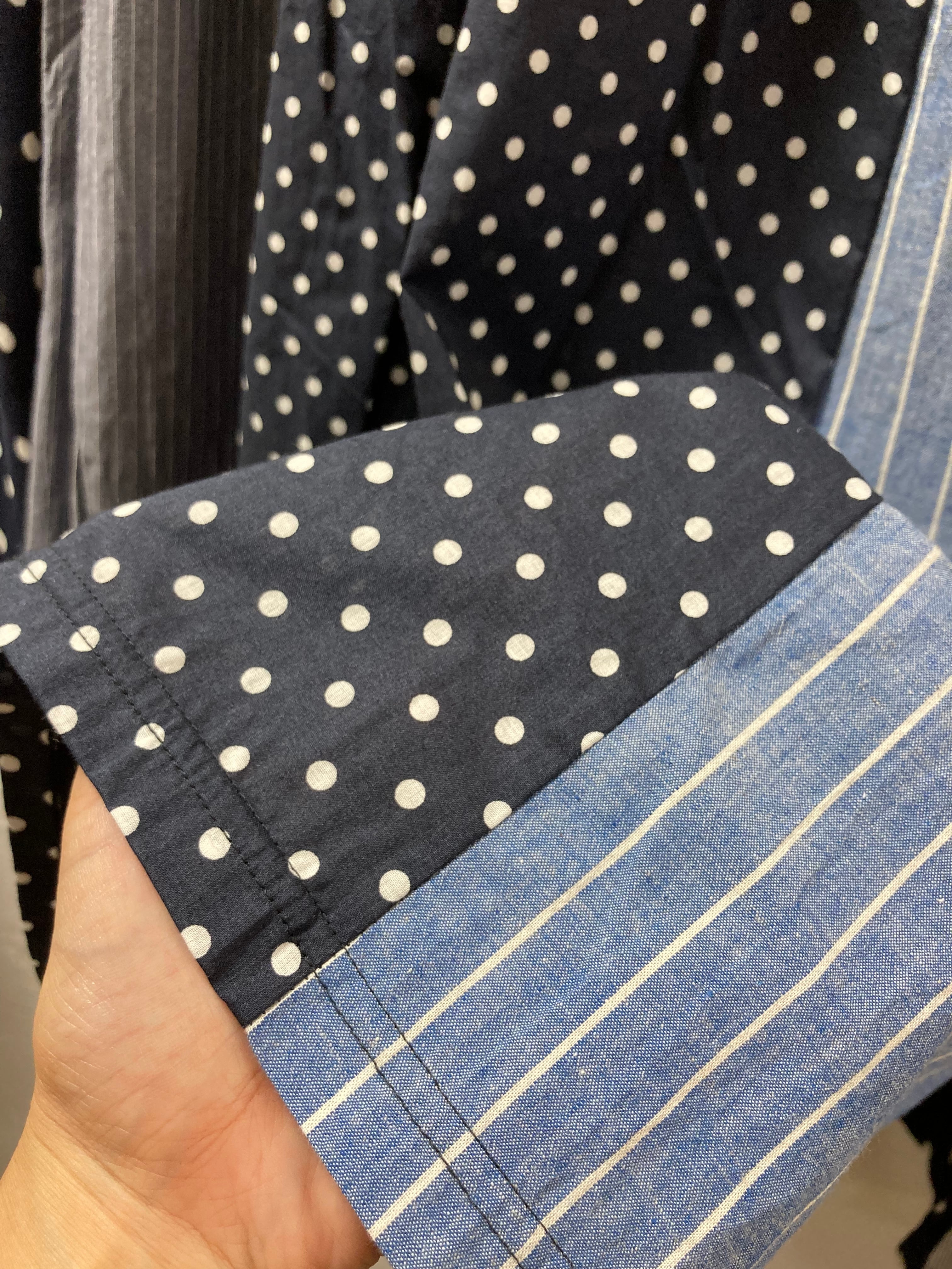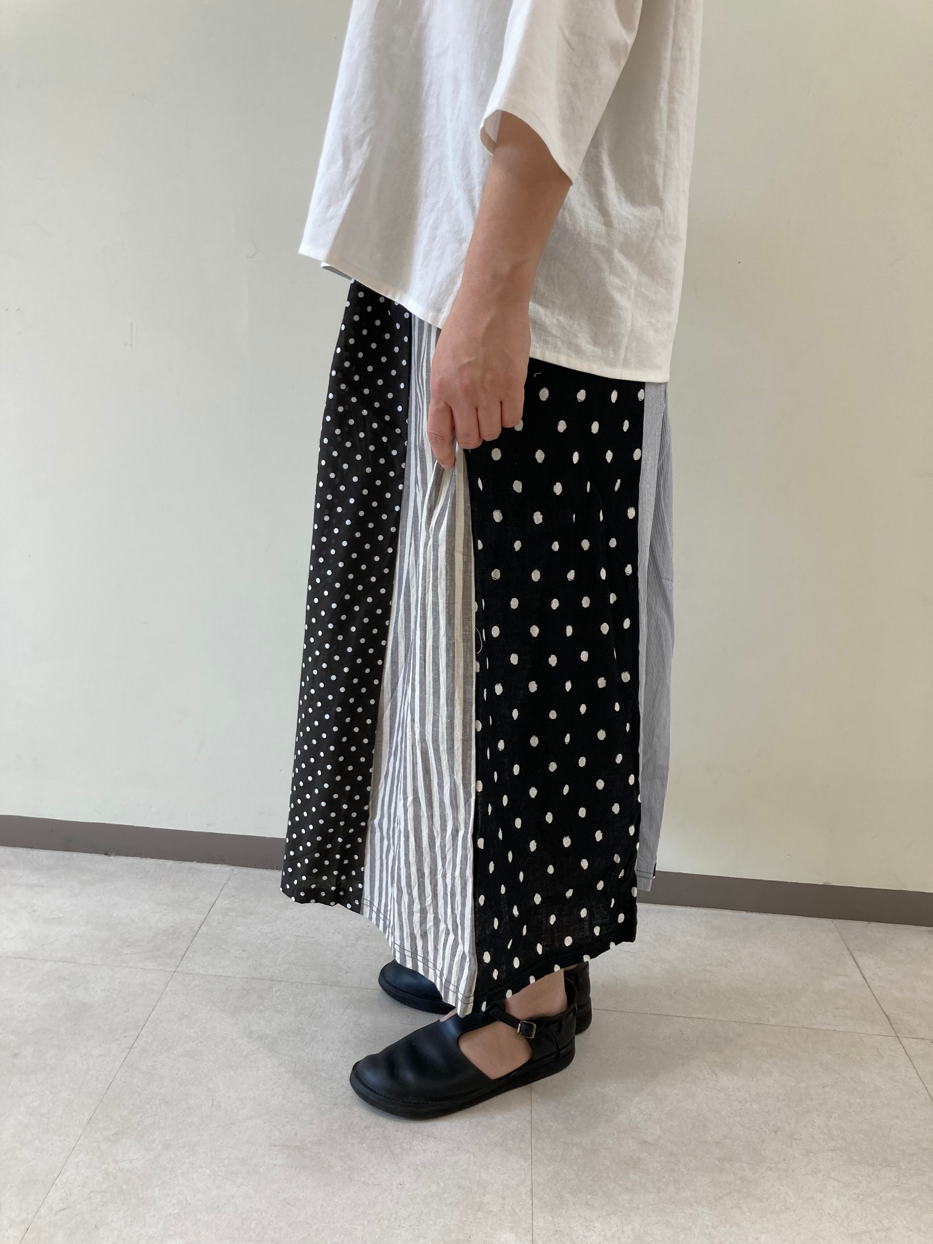4種類の生地を縦に切り替えた履きやすいスカートです。カジュアルなスタイリングにもよく合います。ウェストはゴムで紐がが通っていてそちらで、調節できます。お洗濯可能。