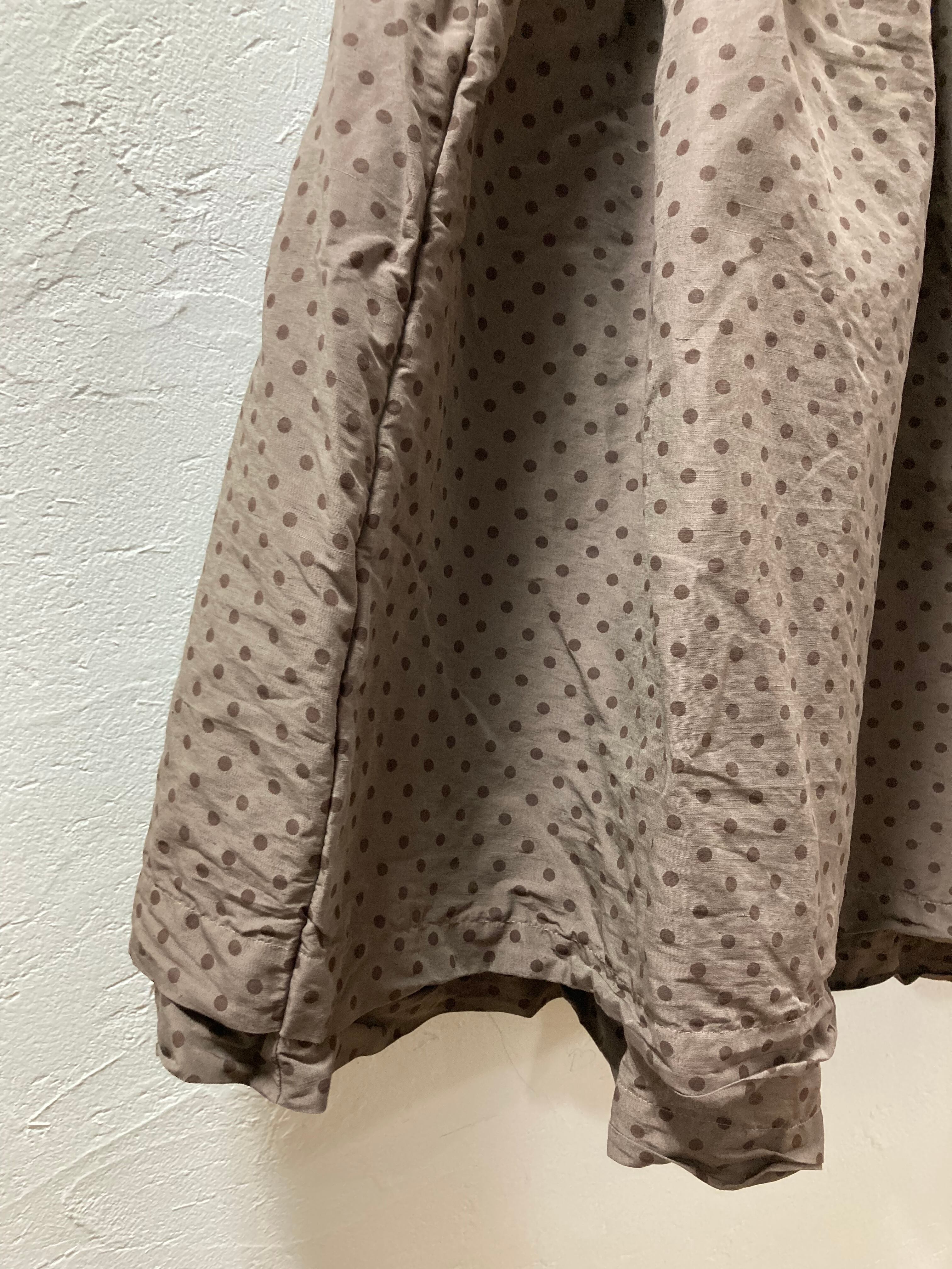 染めに反応する特別な水玉プリント生地で作られた張りのあるスカートです。全体的に二枚重ねで前が、ラップになってます。脇は縫い付けてあるので捲れる心配はありません。同色のドットが落ち着いた可愛いスカートです。左脇ポケット。お洗濯可能。