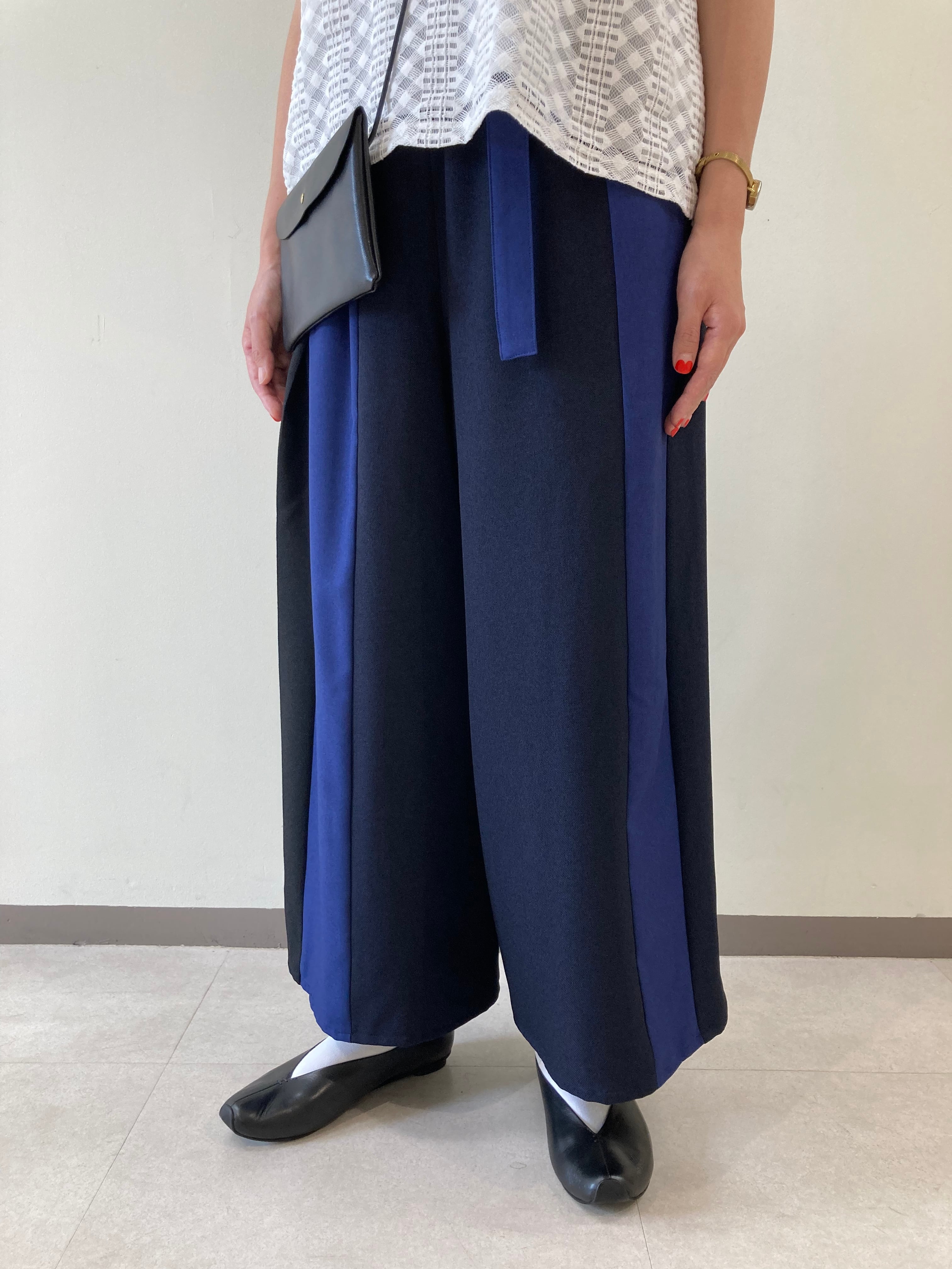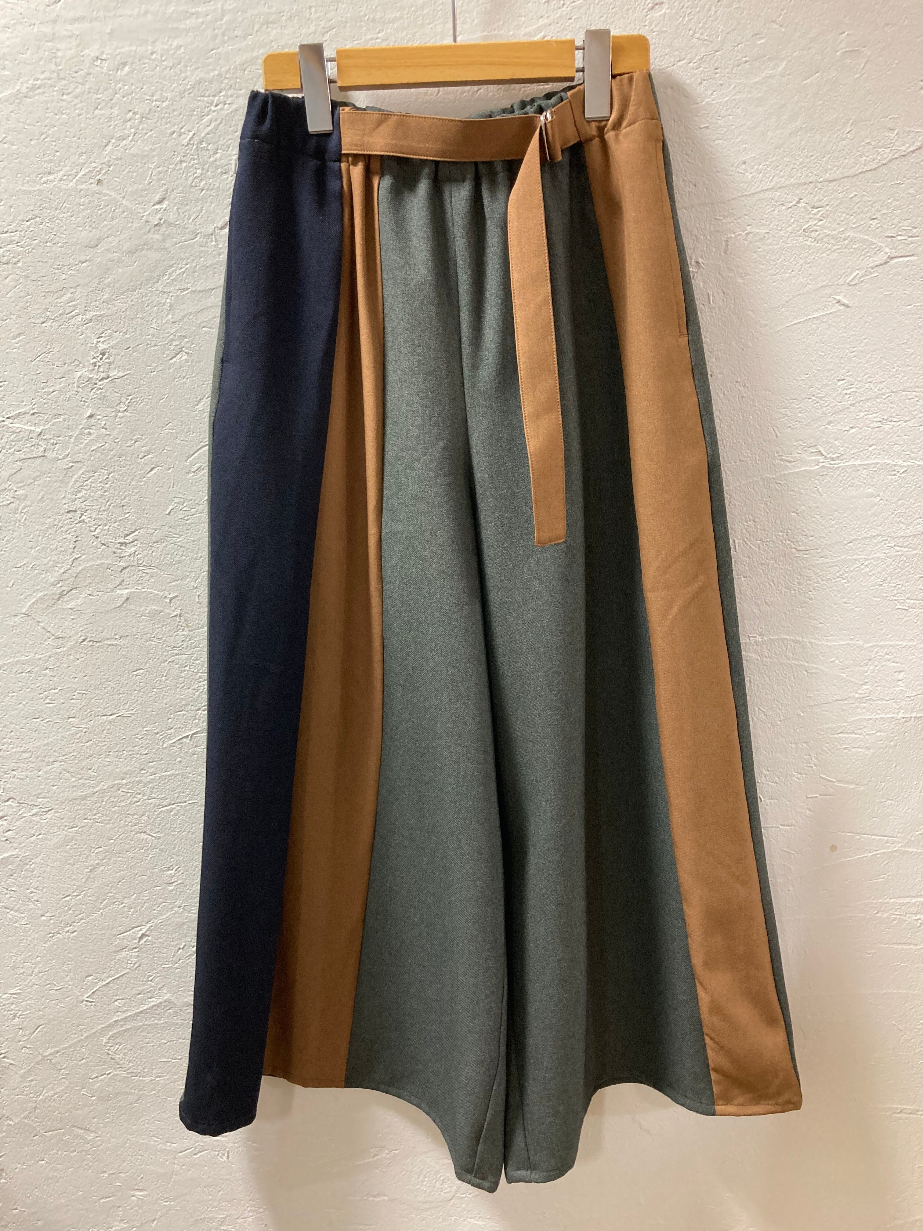 縦に異素材切り替えのあるスッキリした落ち感のある、ワイドパンツです。三色の生地を使用してます。左右で切り替えのバランスがさりげなく違うのもgommeならでは。後ろはスッキリ無地になります。総ゴムに前のみベルトがついてます。夏の終わりから春まで便利に使えるパンツです。透け感なし。お洗濯可能。