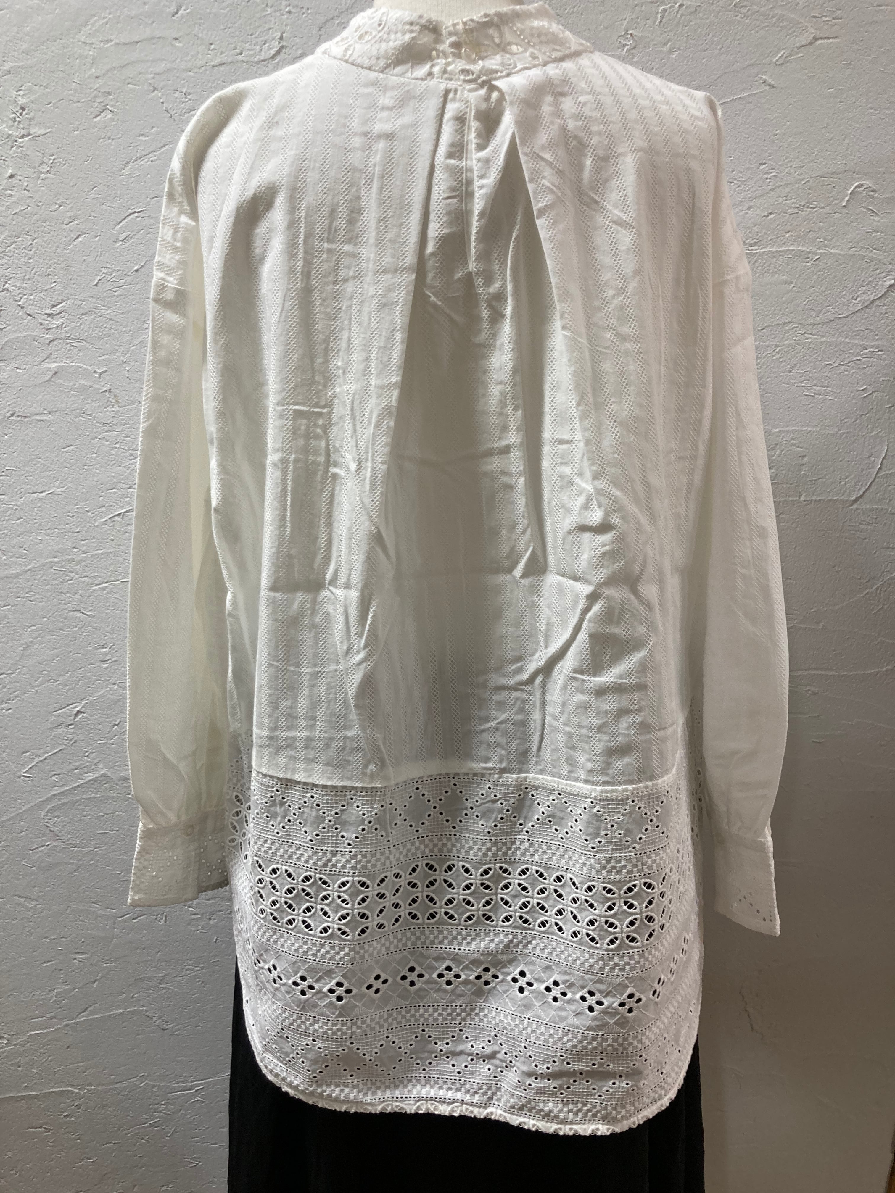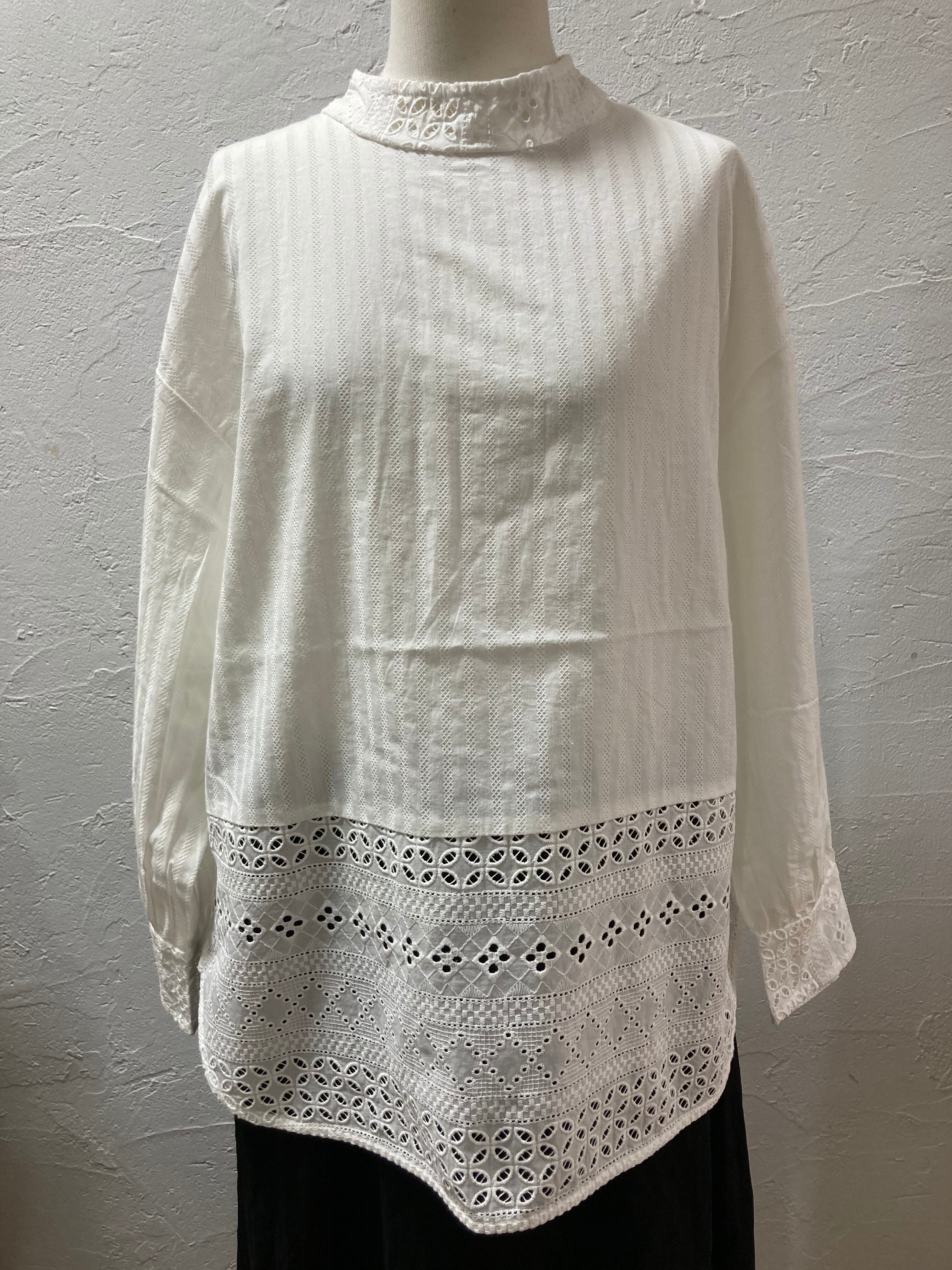 ストライプの地模様生地に裾とカフスと衿にレースの切り替えのブラウス。後ろのタックもポイントです。スカッとした白の綺麗なブラウスです