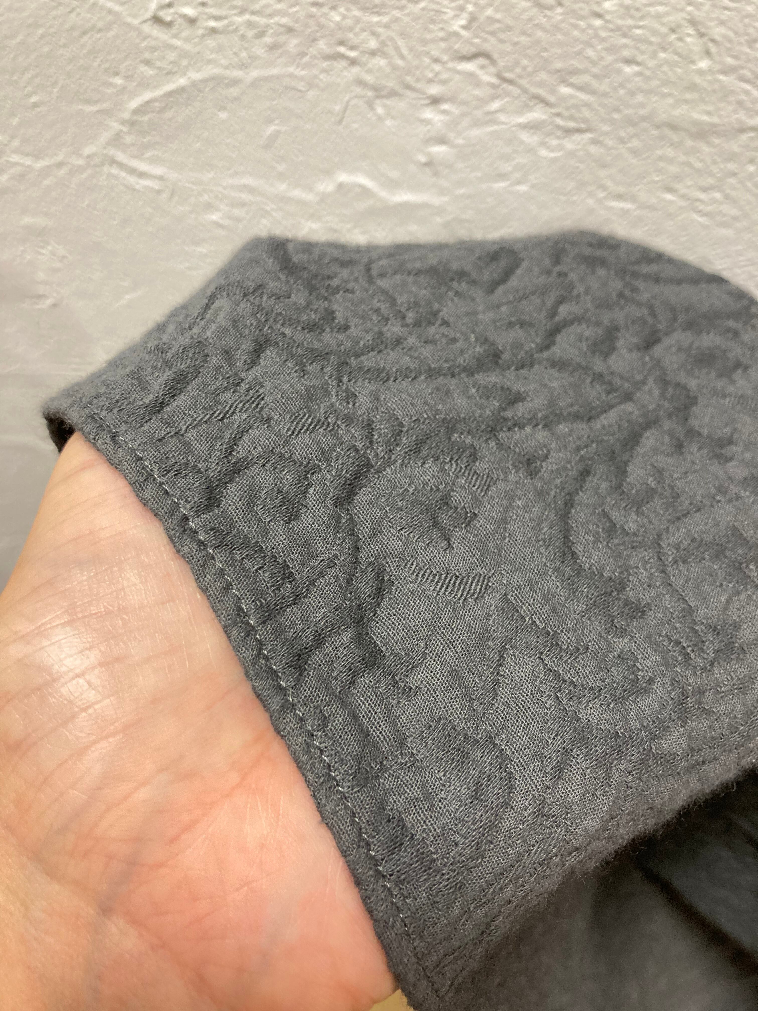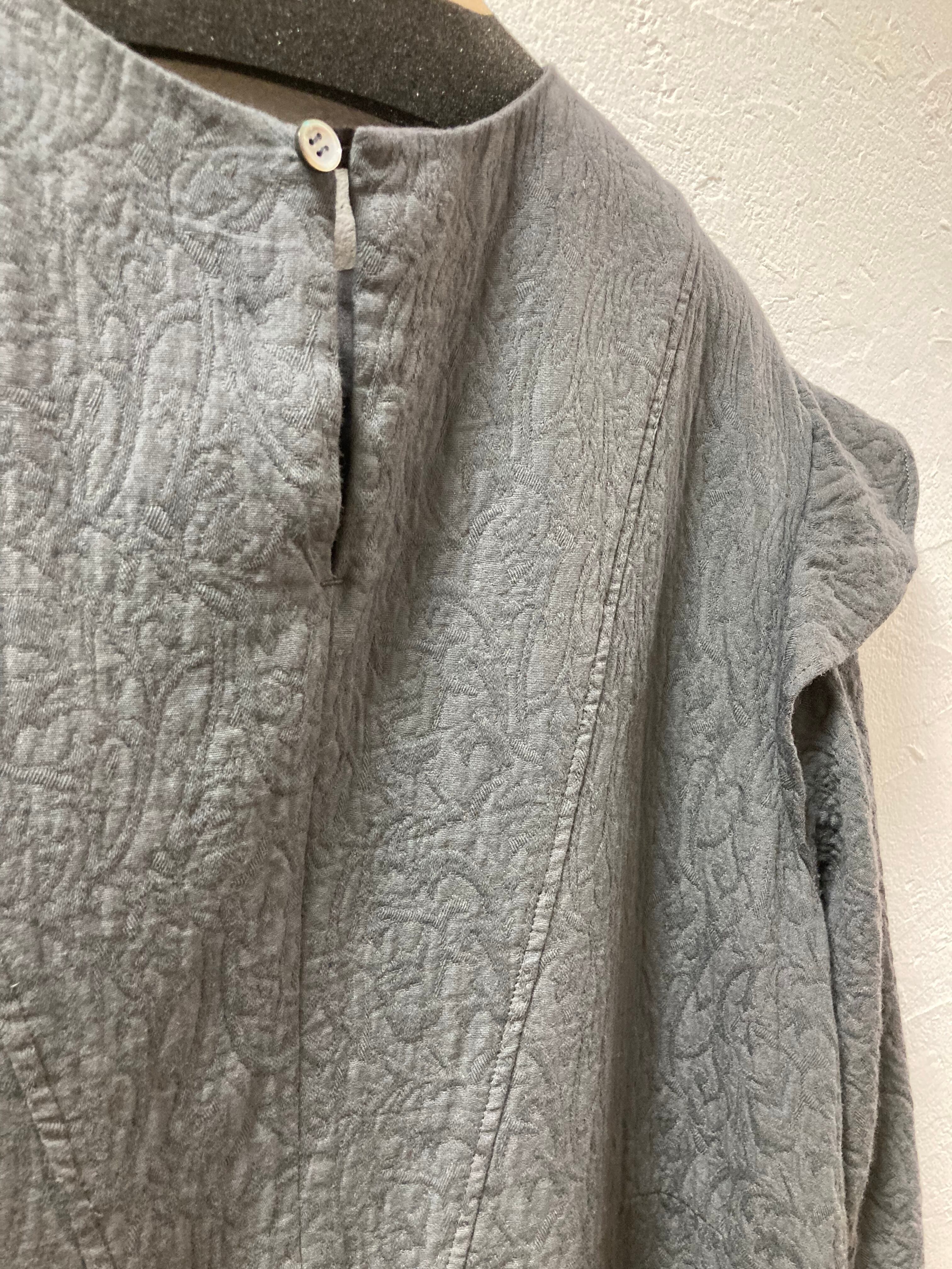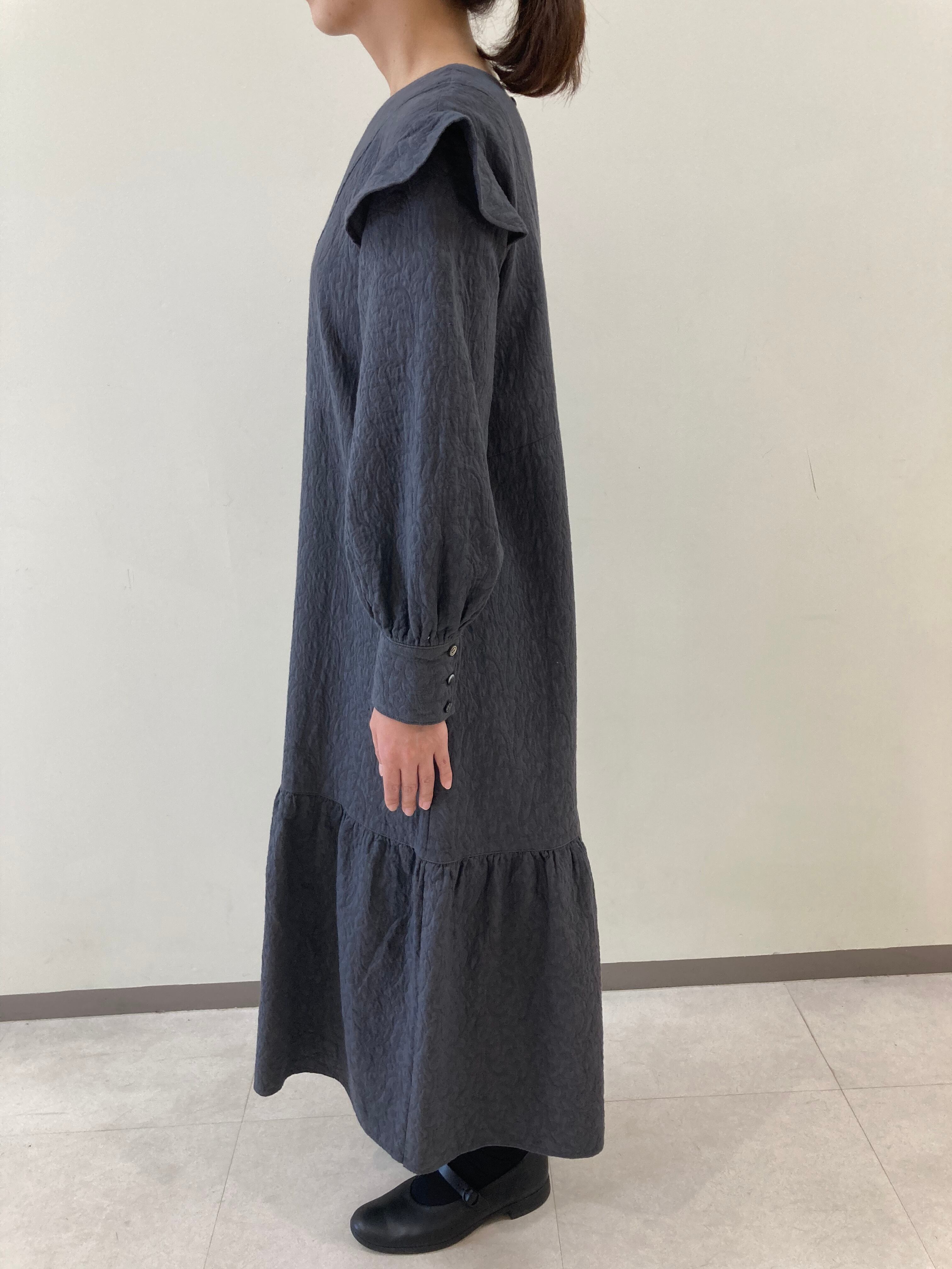 陰影のある凸凹が美しいドビーは柔らかでふんわり温かいのが特徴です。フレアと、ギャザーが甘めなデザインですが、アンティークライクな染め色で着やすい一枚です。製品染の、落ち着いたチャコールグレーです。一枚できまる、素敵なワンピースですよ。生地は中肉厚ですが柔らかいです。