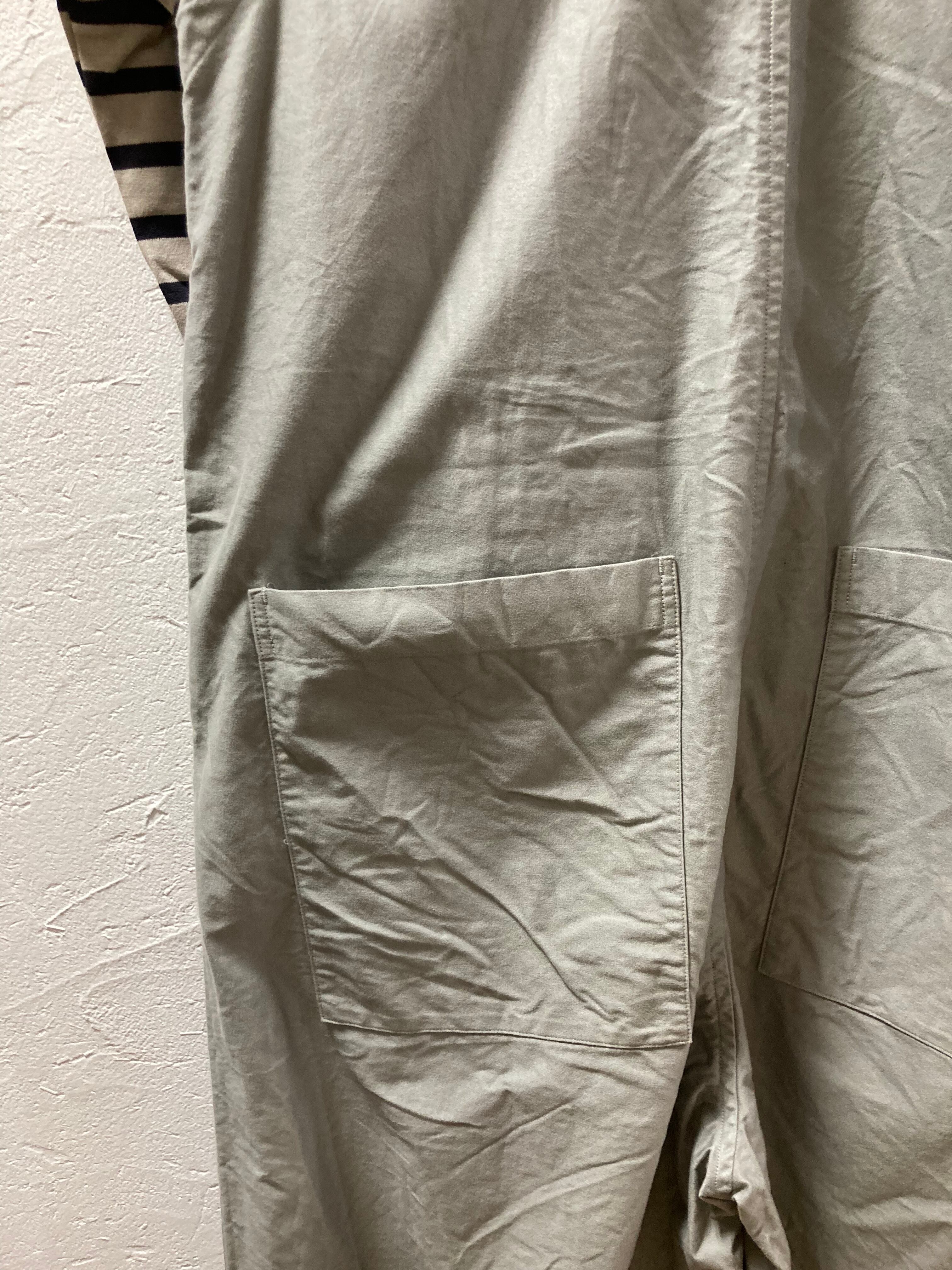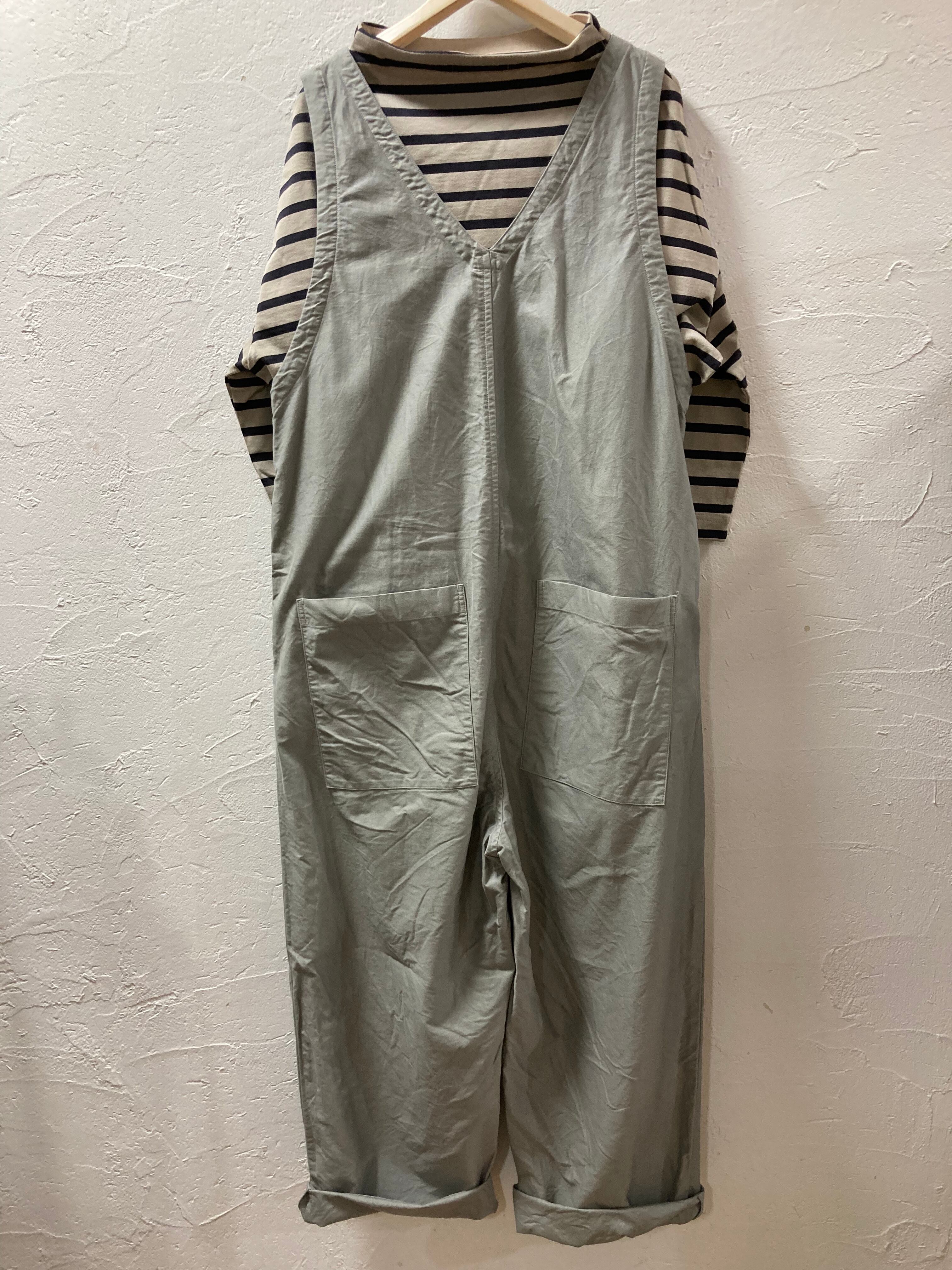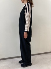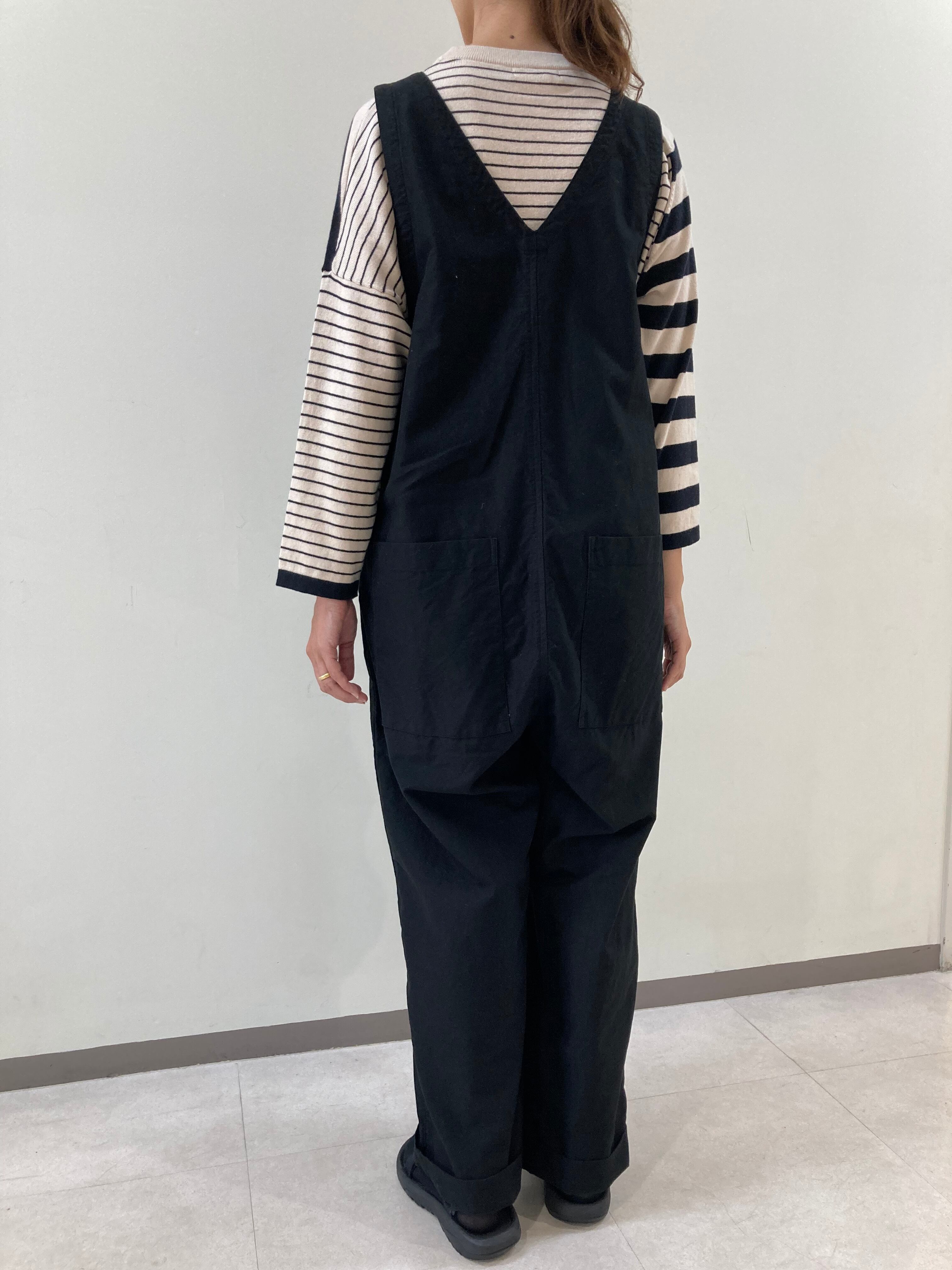 大きくVに開いた首元が、大人な雰囲気のオールインワンです。軽く起毛したモールスキン生地を使用してます。アームホールもゆったり開いてるので、トップスも重ねやすいです。お尻周りもゆったり楽ちんです。手洗い可能です。