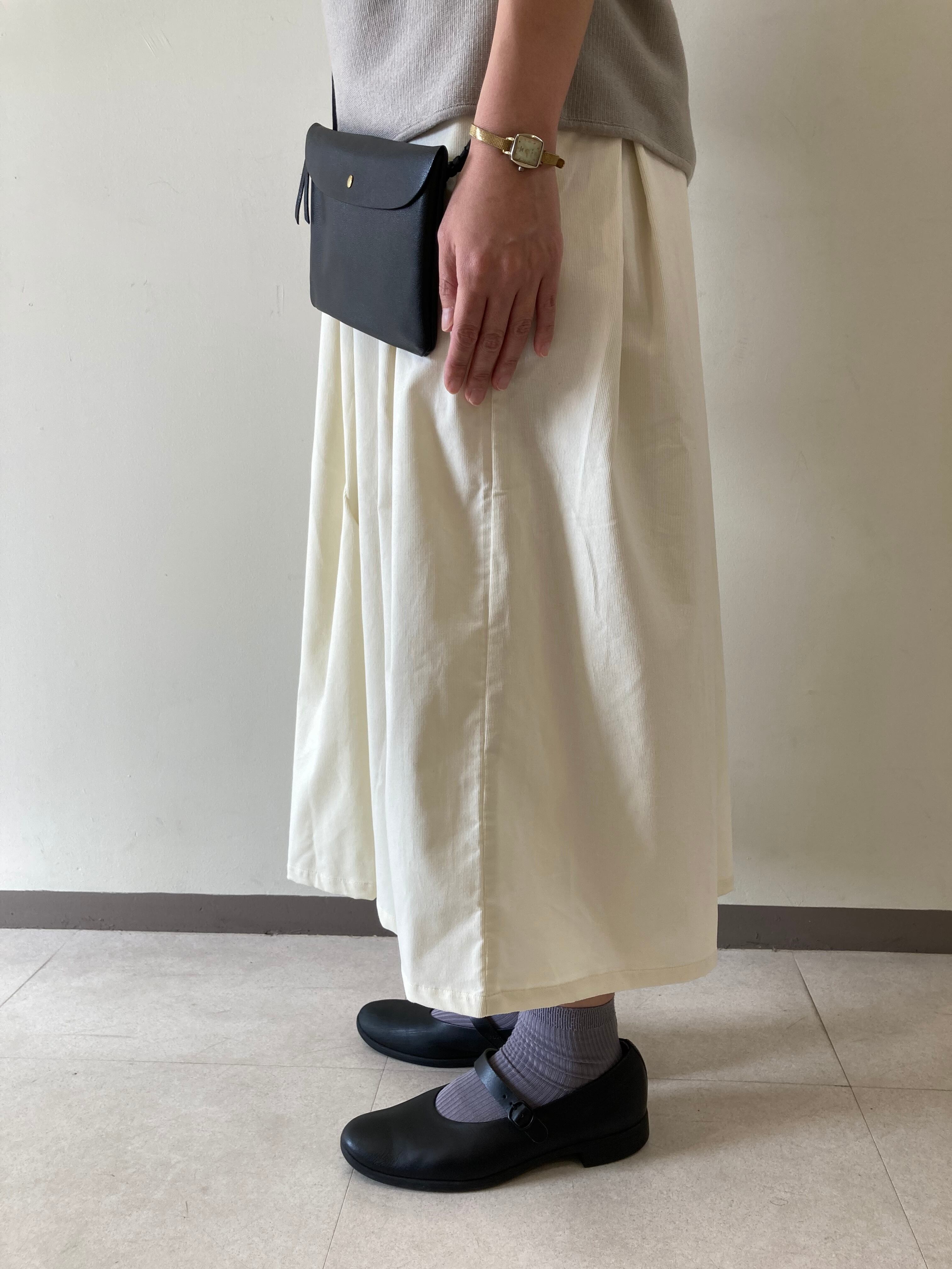 お腹周りはタックなのですっきりしたシルエットです。秋冬ならではの温かみのある素材感です。ウェスト調節紐あります。両脇ポケット有り。お洗濯可能。