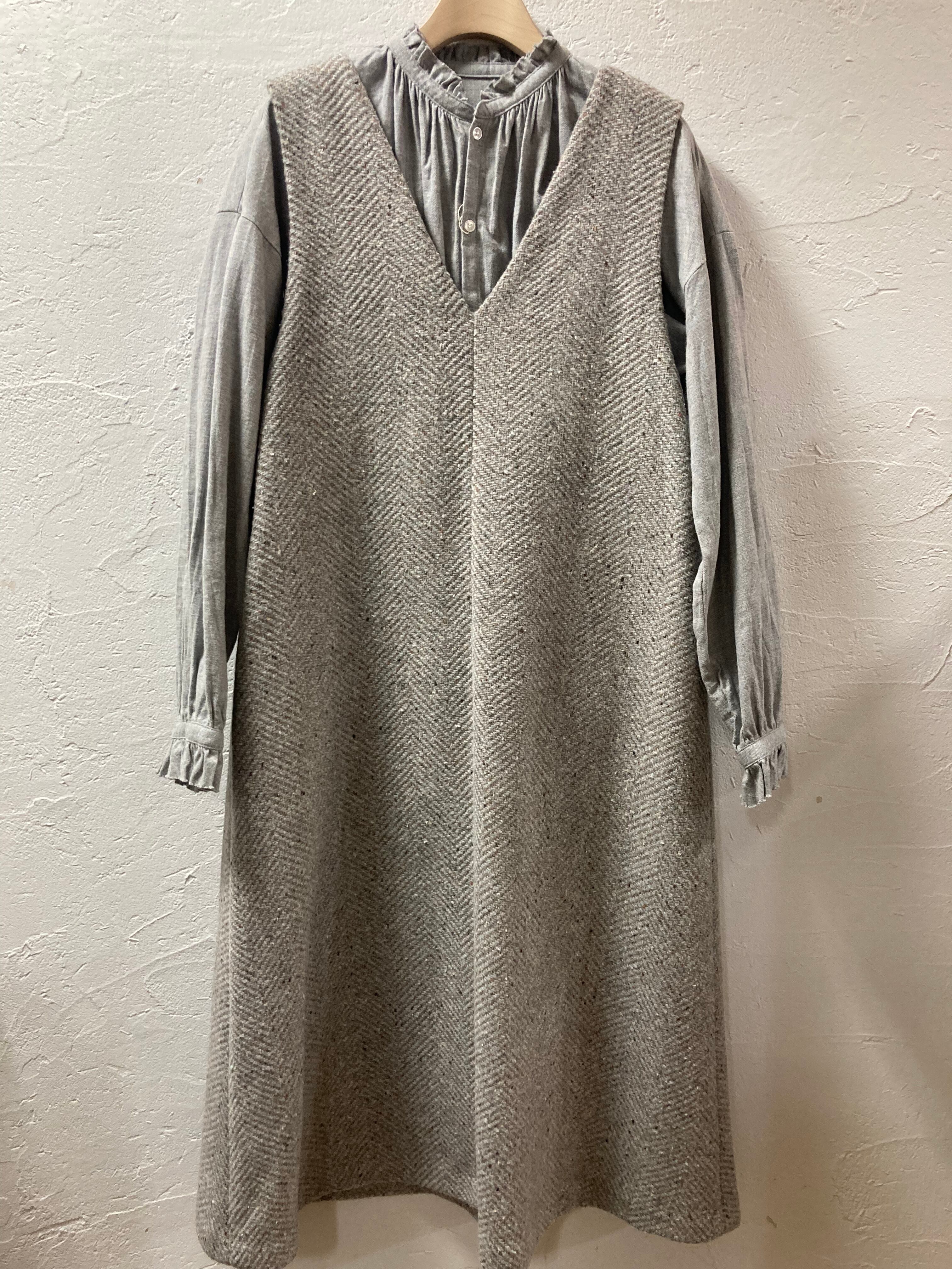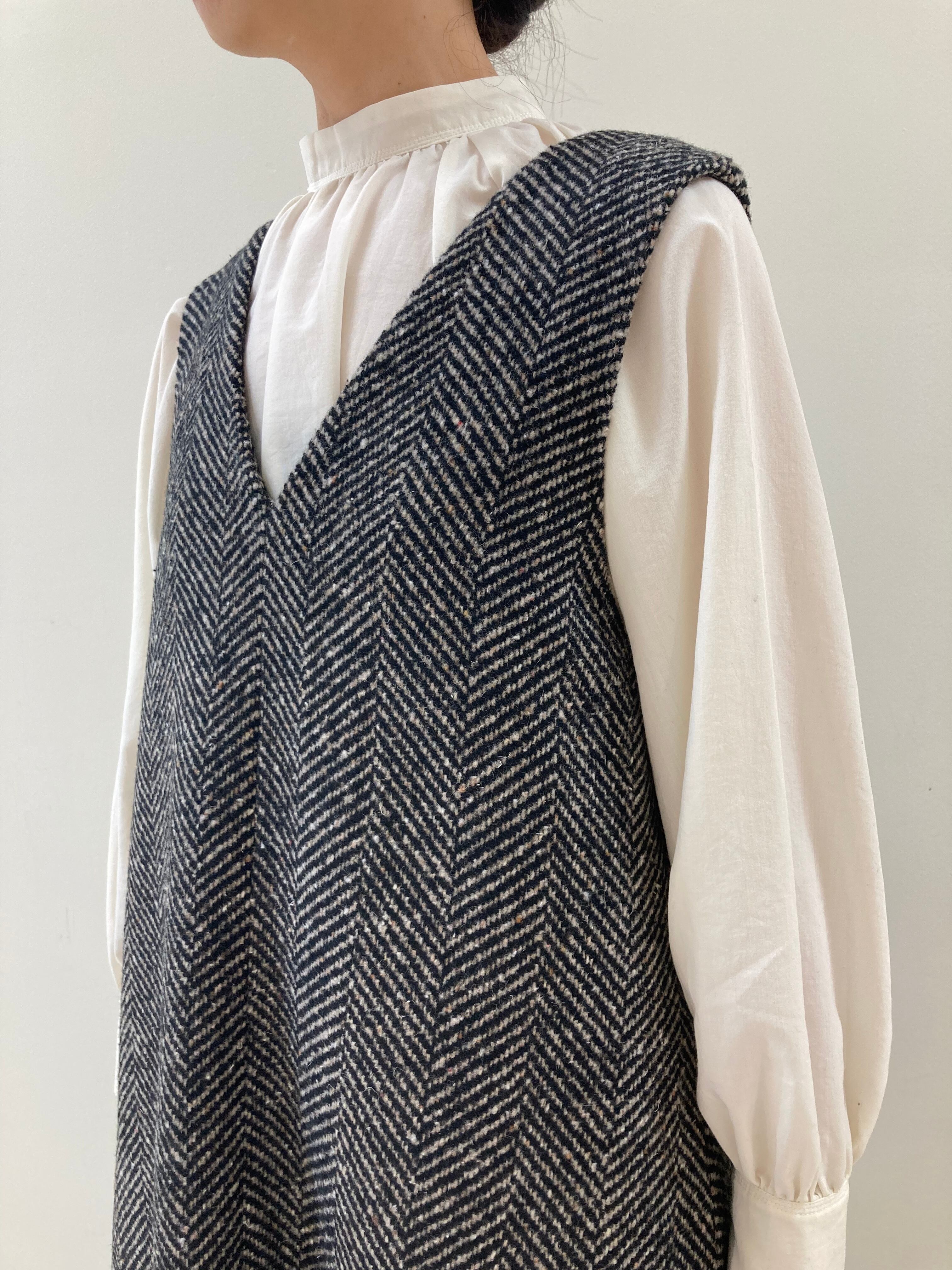 上品なヘリンボーンの、ジャンパースカート。脇下ファスナーで着脱できます。シンプルでスッキリしていて中には、タートルネックもブラウスもよく合います。