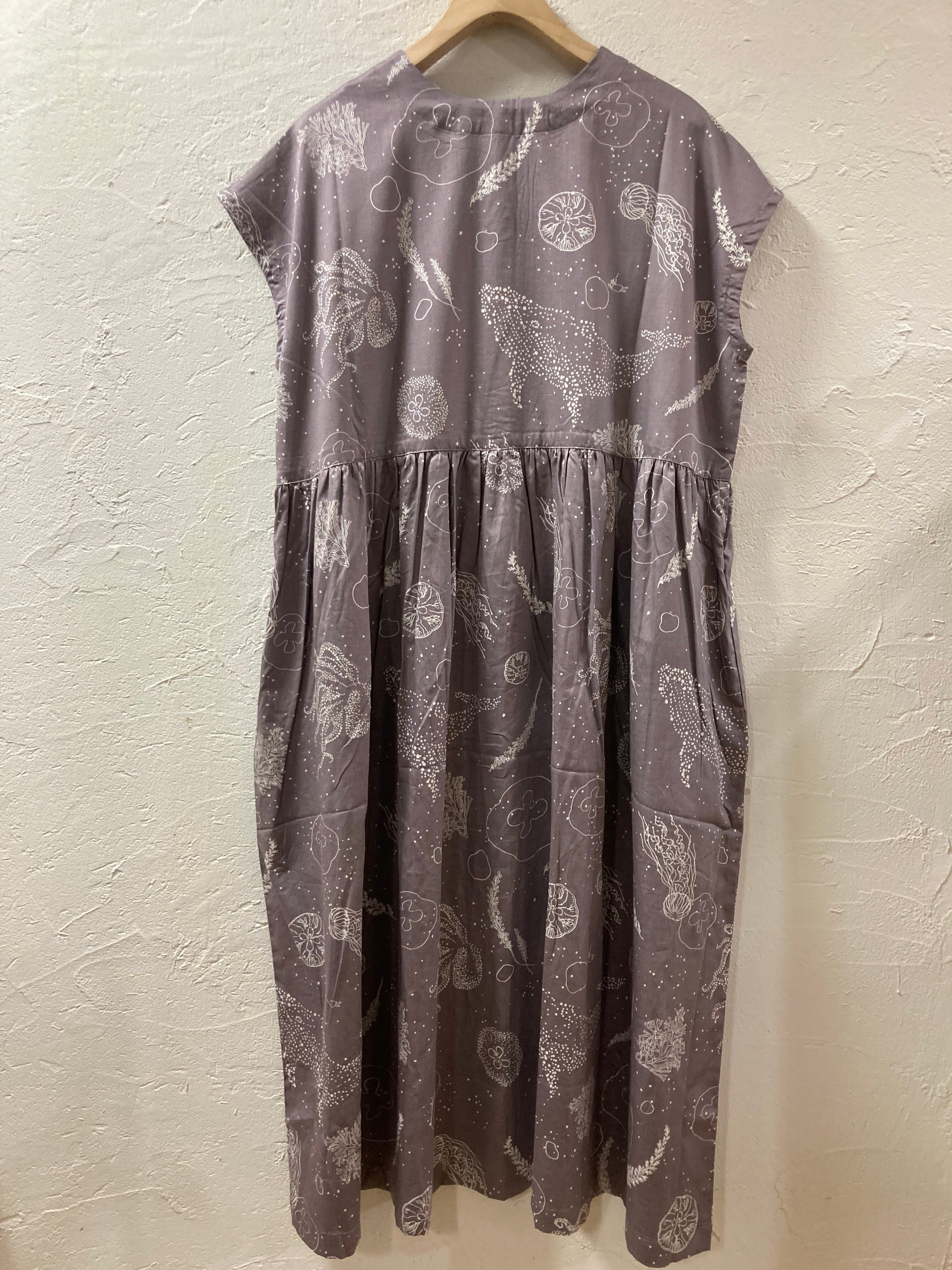 海底の風景を描いたプリント。上品なツヤのあるコットンサテン生地に、細やかな線と点描で描かれたクジラやタコ、クラゲたちが幻想的なテキスタイルです。